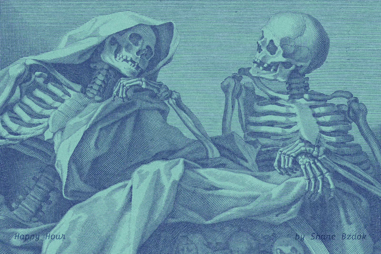 Author’s notes: This very simple poem was inspired entirely by the etching pictured above, which I stumbled upon while researching for another story. The skeletons look so casual and nonchalant. I couldn’t help but wonder what they were talking about.